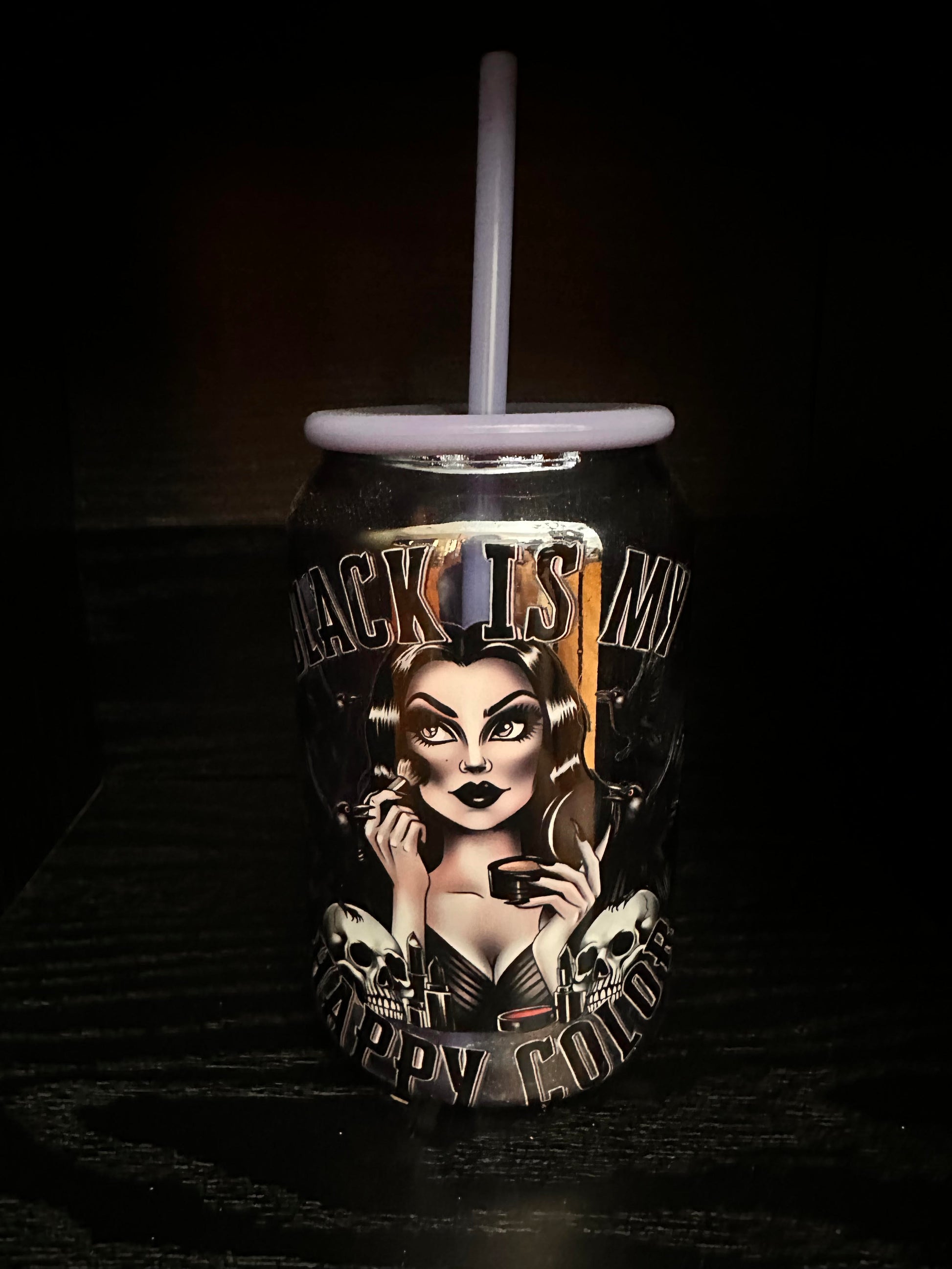 15oz Glass cup with purple lid and straw. Black is my happy color